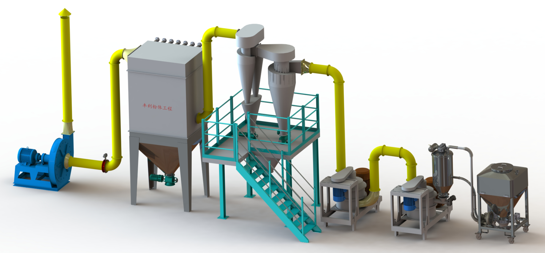 本機(jī)的機(jī)腔為圓筒形,由一環(huán)形將其分為上下兩部分,下部分為進(jìn)氣室,上部分由分流環(huán)分隔成粉碎室和分級室。粉碎室將物料擊碎成細(xì)粉后進(jìn)入分級室,分級室能把細(xì)粉分成粒度達(dá)標(biāo)和未達(dá)標(biāo)兩種規(guī)格,達(dá)標(biāo)細(xì)粉經(jīng)出料管吸出,由旋風(fēng)集料器收集產(chǎn)品。未達(dá)標(biāo)的細(xì)粉沿分流環(huán)內(nèi)壁回落到粉碎室,繼續(xù)粉碎,直到達(dá)標(biāo)為止。