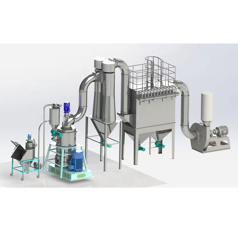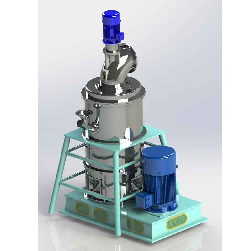 分級(jí)電機(jī)帶動(dòng)分級(jí)輪旋轉(zhuǎn),形成對(duì)粉體的分級(jí)作用。成品粒徑的大小可通過分級(jí)輪轉(zhuǎn)速的快慢進(jìn)行調(diào)節(jié)。不符合要求的粗顆粒被葉片拋向外壁在重力的作用下落入研磨室繼續(xù)進(jìn)行研磨,符合要求的顆粒穿過葉片隨氣流形成氣固兩相流,吸入旋風(fēng)集料器內(nèi),氣流與粉體顆粒被氣固分離后,粉體顆粒被收集。