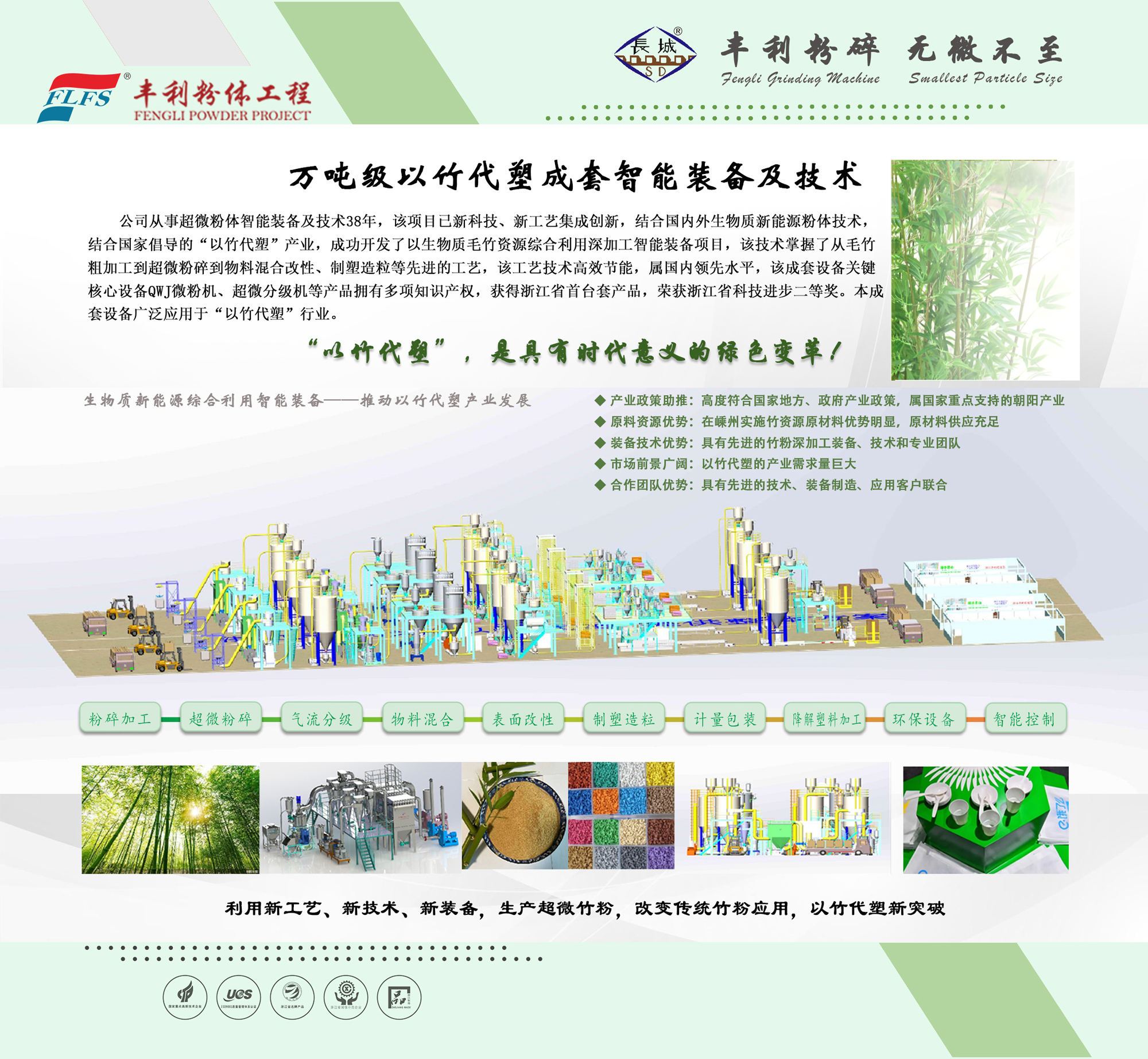 公司從事超微粉體智能裝備及技術(shù)38年,該項目已新科技、新工藝集成創(chuàng)新,結(jié)合國內(nèi)外生物質(zhì)新能源粉體技術(shù),結(jié)合國家倡導的“以竹代塑”產(chǎn)業(yè),成功開發(fā)了以生物質(zhì)毛竹資源綜合利用深加工智能裝備項目,該技術(shù)掌握了從毛竹粗加工到超微粉碎到物料混合改性、制塑造粒等先進的工藝,該工藝技術(shù)高效節(jié)能,屬國內(nèi)領(lǐng)先水平,該成套設(shè)備關(guān)鍵核心設(shè)備QWJ微粉機、超微分級機等產(chǎn)品擁有多項知識產(chǎn)權(quán),獲得浙江省首臺套產(chǎn)品,榮獲浙江省科技進步二等獎。本成套設(shè)備廣泛應用于“以竹代塑”行業(yè)。